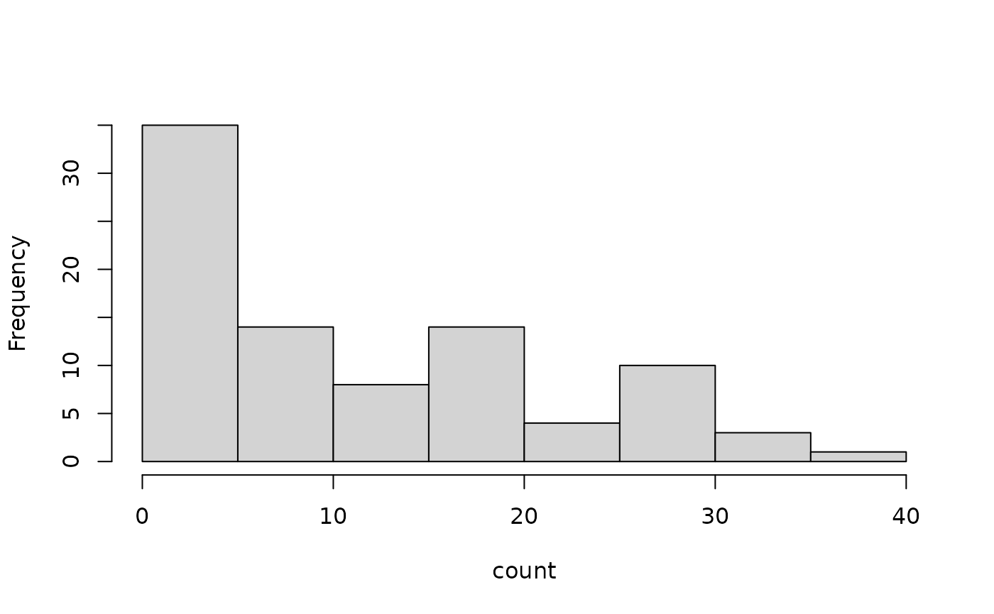 hist(terra::values(r, mat = FALSE), xlab = "count", main = "")
