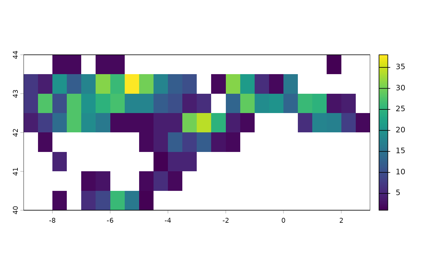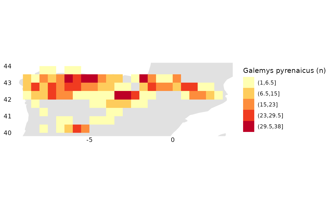 occs_ggmap_gridded(terra::trim(r), legend_title = "Galemys pyrenaicus (n)")## S4 class 'SpatRaster' [package "terra"]