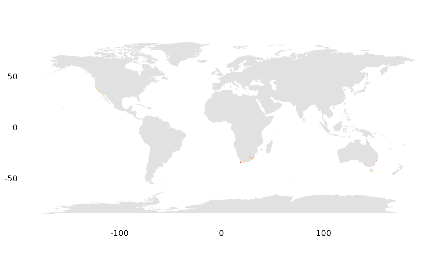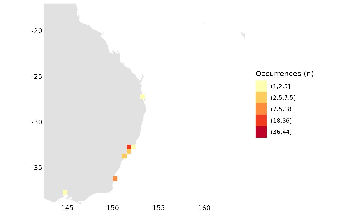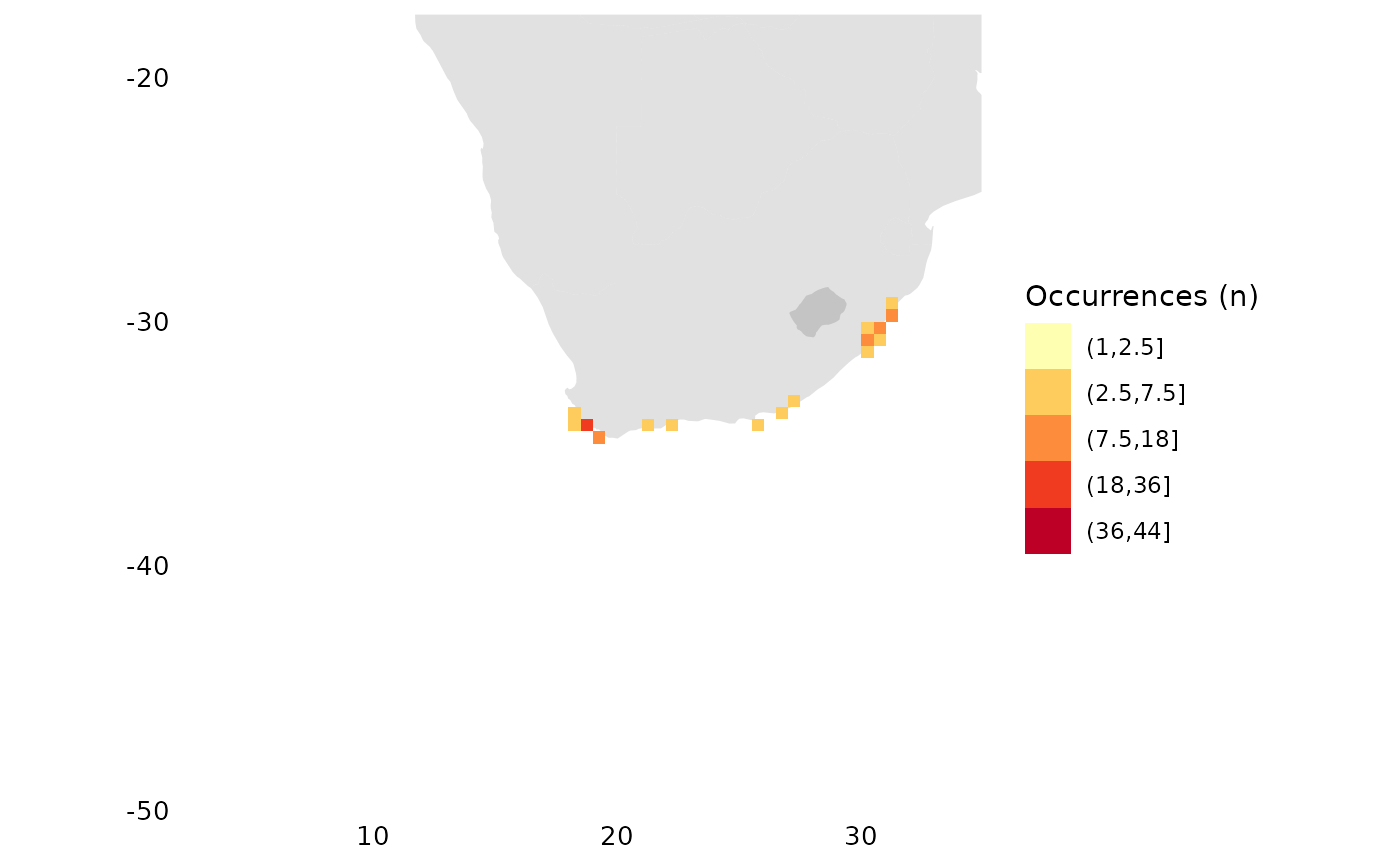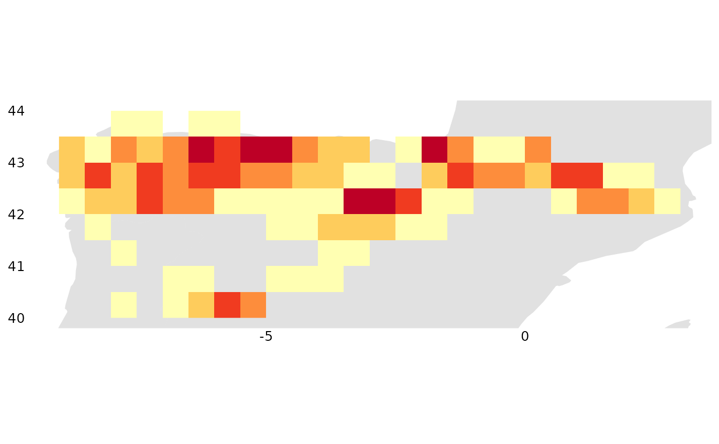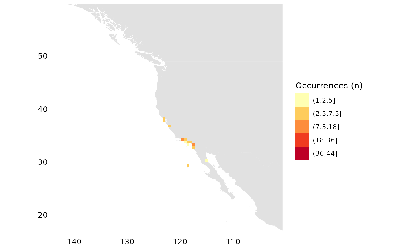 occs_ggmap_gridded(terra::trim(r), legend = FALSE)## S4 class 'SpatRaster' [package "terra"]