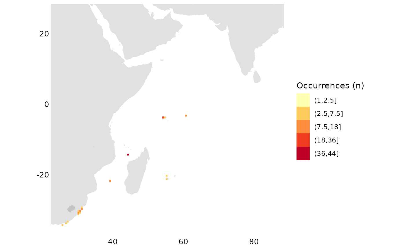 occs_ggmap_gridded(r, center = p, padding = 10)## S4 class 'SpatRaster' [package "terra"]